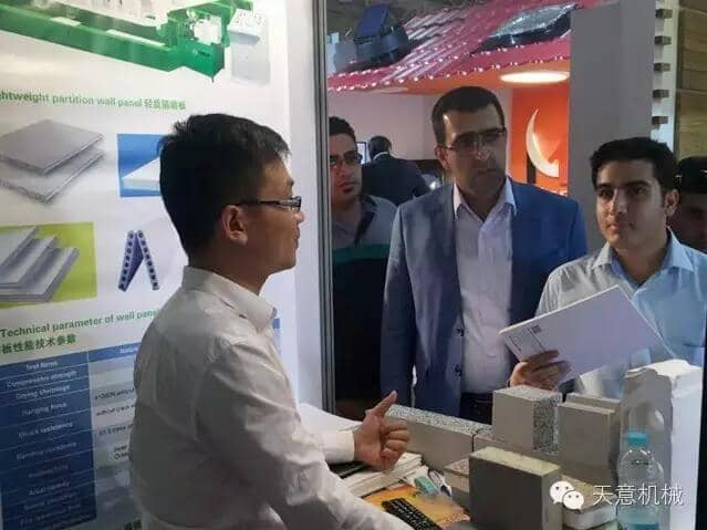 展會(huì)上,天意機(jī)械銷(xiāo)售經(jīng)理劉春剛細(xì)心的向前來(lái)咨詢的客戶,介紹了天意綠色建筑建材裝備在建筑行業(yè)內(nèi)的應(yīng)用優(yōu)勢(shì),通過(guò)觀看產(chǎn)品應(yīng)用視頻以及展現(xiàn)成品樣塊,使得天意展位前門(mén)庭若市。期間,外貿(mào)部銷(xiāo)售經(jīng)理劉春剛,專程拜訪了天意公司在伊朗年產(chǎn)50萬(wàn)平方的輕質(zhì)墻板生產(chǎn)線合作伙伴。詳細(xì)了解客戶的生產(chǎn)情況,幫助客戶免費(fèi)升級(jí)技術(shù)配方降低成本。