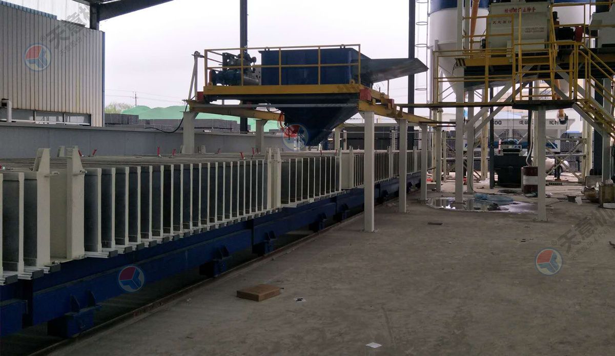TY20型輕質(zhì)墻板生產(chǎn)線包括:墻板成型機(jī)、整體穿抽管系統(tǒng)、發(fā)泡系統(tǒng)、水箱、電子計(jì)量儲料倉、螺旋上料輸送機(jī)、儲料罐、螺旋輸送機(jī)、EPS熟化料倉、硫化干燥床、EPS預(yù)發(fā)機(jī)、數(shù)控配電室、發(fā)泡攪拌機(jī)、整體出板系統(tǒng)、叉車、成品堆放區(qū)、擺渡車。